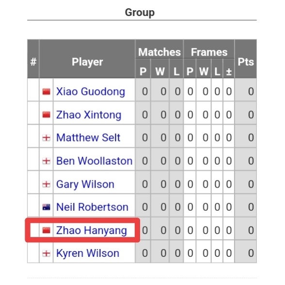 而已经在德国大师赛资格赛出局的马修·塞尔特和本·沃拉斯顿则有幸递补入列,跟囧哥凯伦·威尔逊、澳洲萝卜尼尔·罗伯逊和新科世锦赛冠军赵心童,凑成一台,有好戏看了。