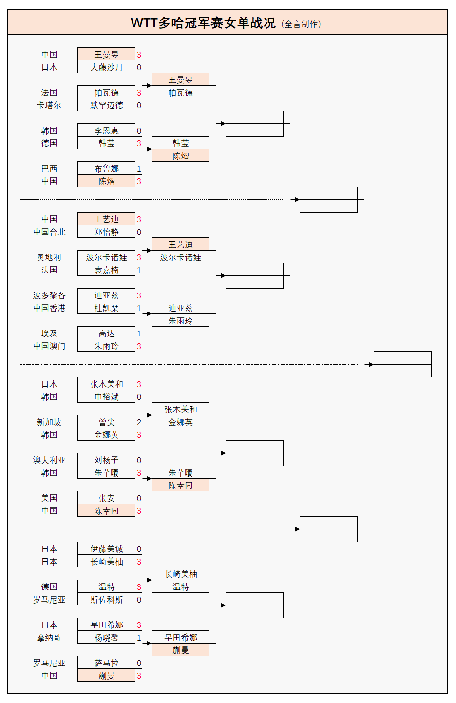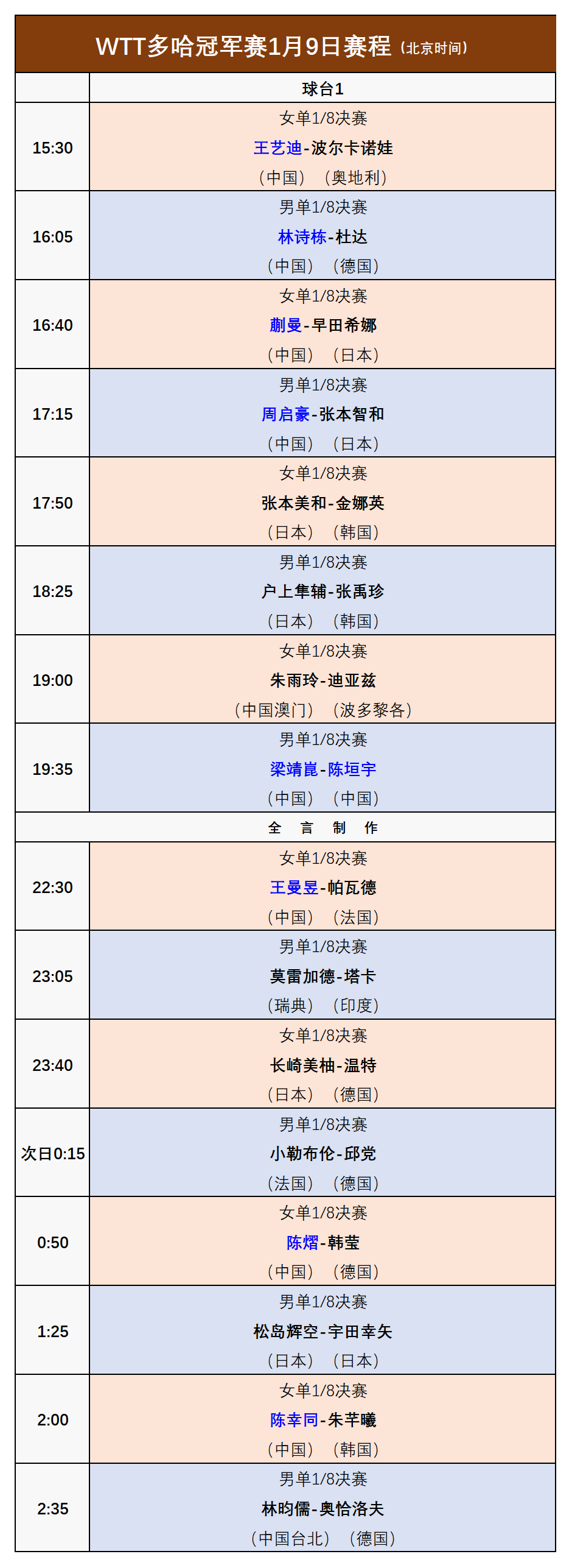 WTT多哈冠军赛:1月9日赛程公布!国乒再战张本智和、早田希娜