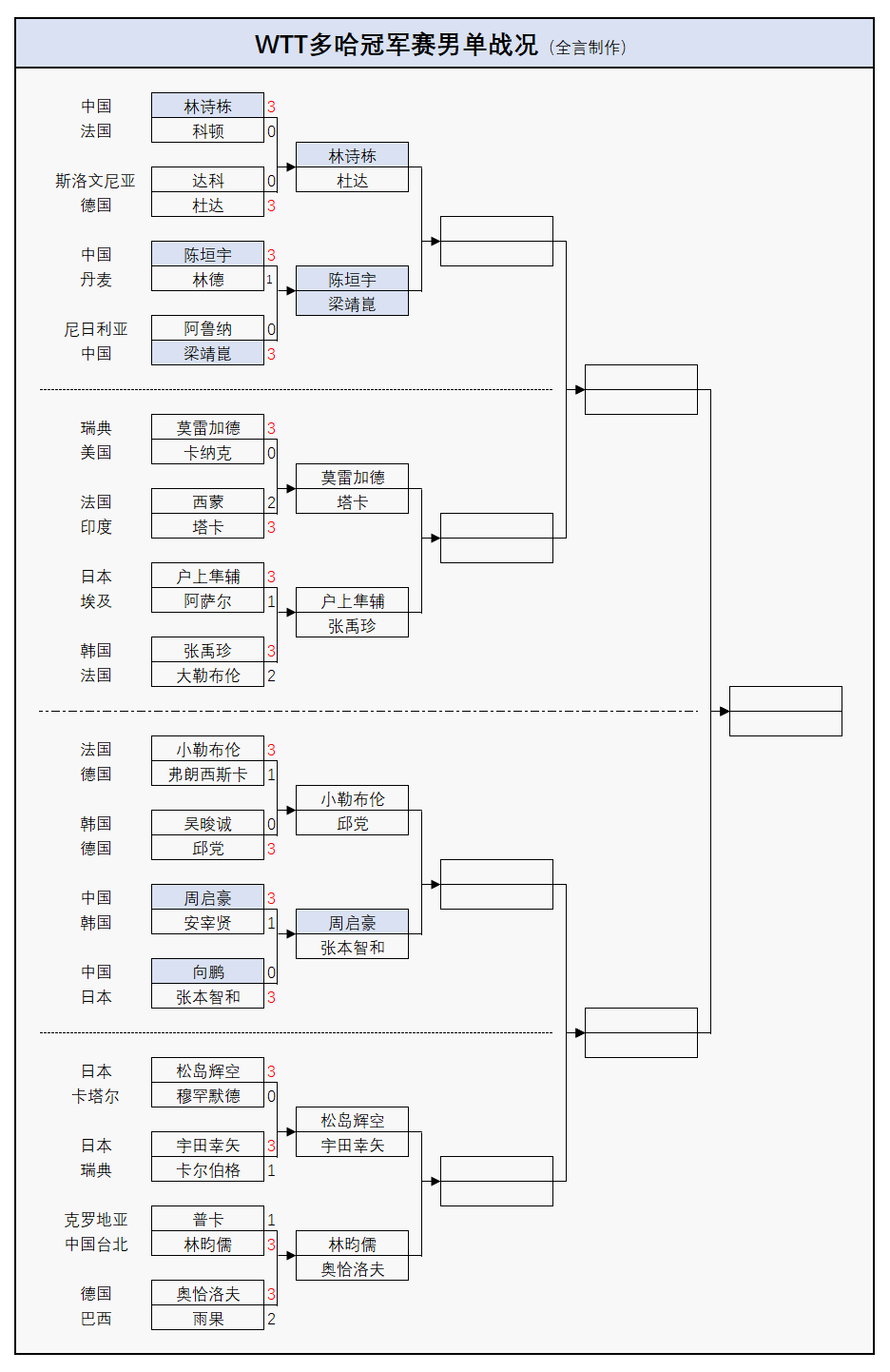 这几场比赛的对阵双方都具备不俗的水平,张本美和、莫雷加德、松岛辉空的优势可能相对更大但也未必不会被爆冷,其余场次的结果相对更难预测,那就让我们一起坐等最新战报传回吧!