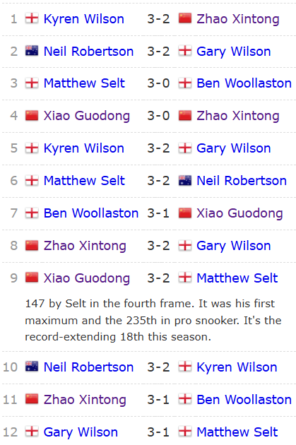 赵心童,4战2胜2负。首战囧哥,赵心童轰两破百(127、140),但2-3不敌囧哥凯伦·威尔逊。次战,赵心童被肖国栋零封。第3战,赵心童打出3杆70+,3-2胜的哥加里·威尔逊。第4战,赵心童打出3杆50+,3-1胜沃拉斯顿。