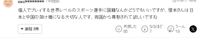 “对于个人竞技的世界级运动员来说,国籍并不重要,但张本智和是一位重要的人物,他是日本和中国之间的桥梁,我希望他能受到两国人民的尊重。”