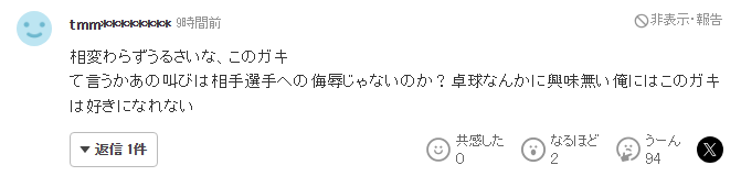比赛结束后,虽然日本网友直言张本智和很强,但也有不少网友对张本智和全场的怒吼感到不爽:
