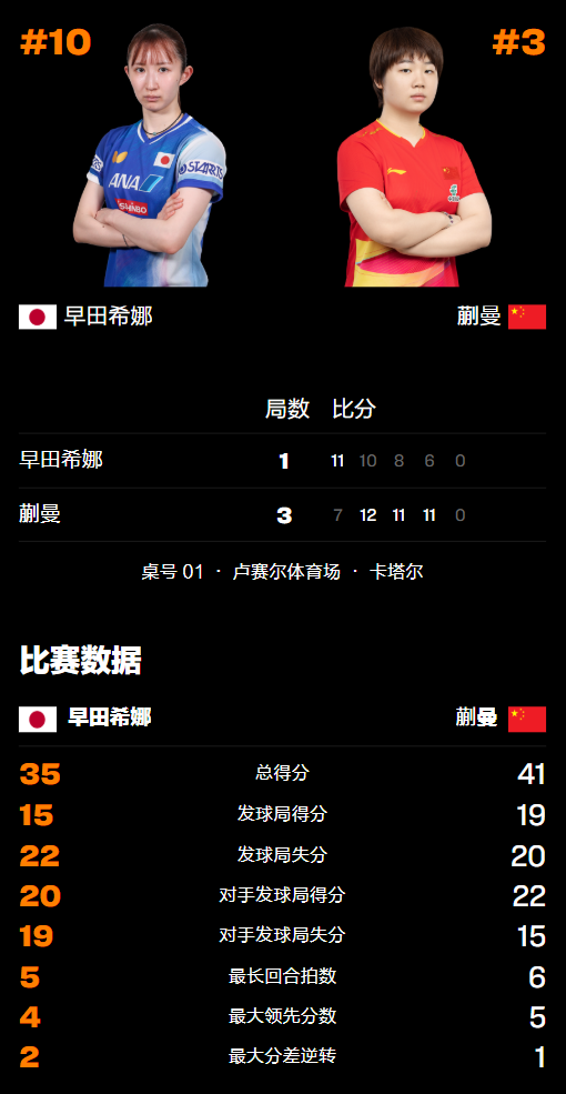 第三局蒯曼开局领先再次被早田希娜缩小差距,两人继续展开激烈对抗,蒯曼8-3领先后连丢3分出现保守心态,随后调整状态继续积极抢攻以10-6拿到局点,随后错失2分没有再给对手机会,最终以11-8取胜将早田希娜逼入绝境。