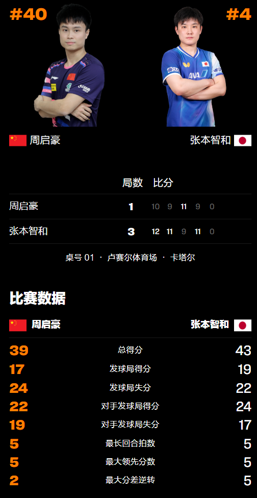 比赛开始后,周启豪先丢1分但随后迅速反超对手,随后7-2领先逐渐拉开分差,不过很快又被张本智和的反手搏杀打乱阵脚,尤其是台内速度对抗明显下风,很快便被追至8-7只差1分,于是选择暂停进行调整,紧接着9-10被反超挽救局点,但最终还是以10-12惜败先丢一城。