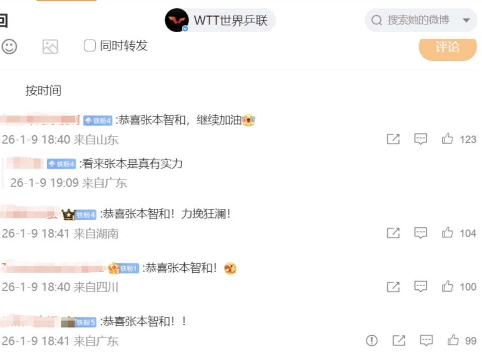 在被央媒点名之后,张本智和连胜国乒队员向鹏、周启豪。而令人意外的是,比赛结束之后,在WTT世界乒联官方账号的评论区里,竟然出现了“一边倒”支持张本智和的现象!