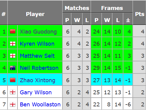 肖国栋前一日2胜1负,第4战,决胜局136破百,3-2胜罗伯逊;第5战,肖国栋1-3不敌打出两杆破百的囧哥威尔逊;末战,肖国栋打出两杆50+,零封加里·威尔逊。6战4胜2负,肖国栋以净胜局优势力压囧哥,位列小组第一。