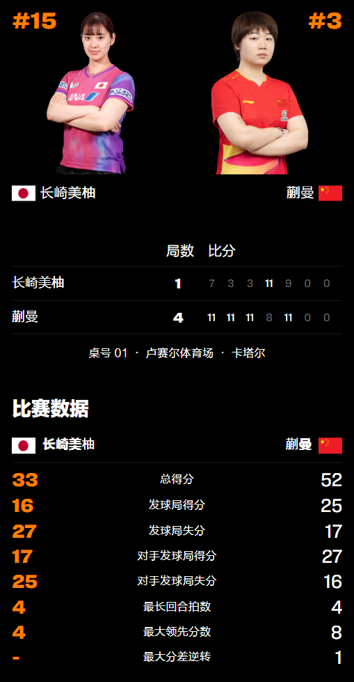 虽然长崎美柚成名更早,但在乒坛的段位始终不上不下,目前已经明显落后于蒯曼。而在此之前,这两位选手曾在国际赛场上3次相遇,结果都是蒯曼笑到最后,最近的对决更是3-0大获全胜,所以此战普遍更看好她再次胜出。