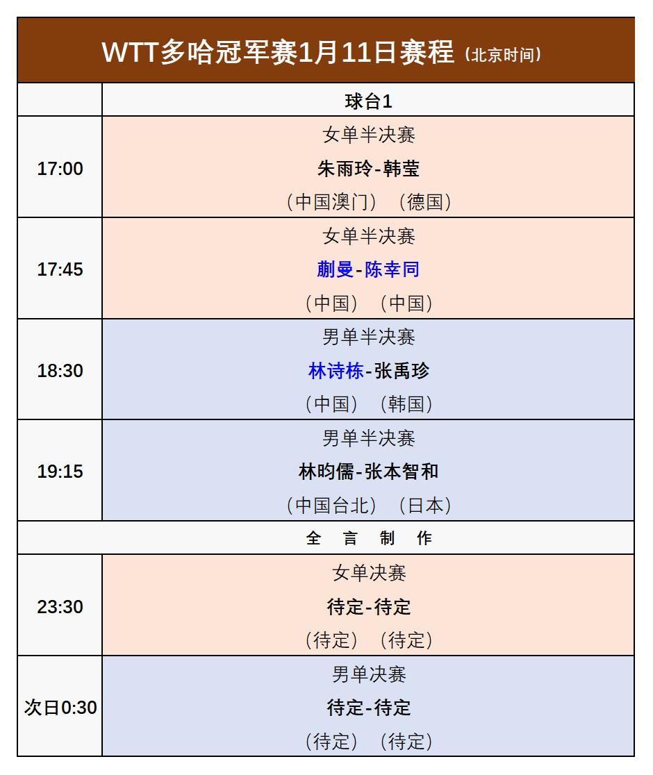 WTT多哈冠军赛1月11日赛程:诞生2项冠军!国乒3大主力出战