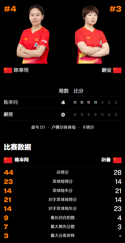 第四局蒯曼的表现仍然不理想,上来就不断丢分陷入被动,陈幸同很快便4-1领先但紧接着被追至4-4平,但后半段她很快便再次压制对手,在回球的线路上也更加灵活,不断突破蒯曼的正手空档并取得9-4、10-5领先的优势,错失1个赛点后以11-6锁定胜利,由此而强势零封队友晋级决赛。