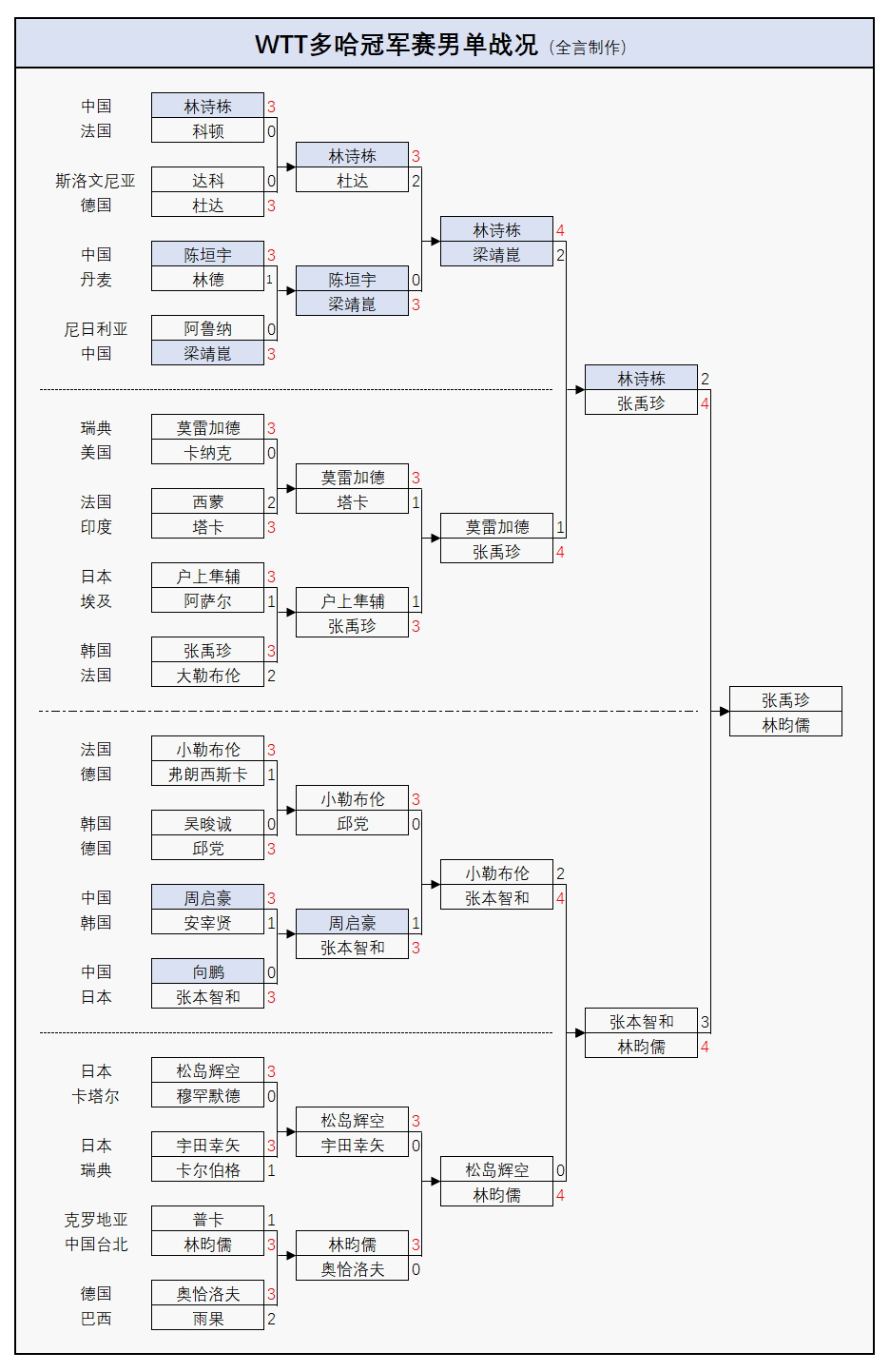 本次比赛国乒男单损失惨重,其中内战陈垣宇输梁靖崑、梁靖崑输林诗栋,外战向鹏、周启豪输张本智和,林诗栋不敌张禹珍,张禹珍成功闯入最后一轮,而林昀儒虽然没有遇到国乒选手,却打败了一位德国世界冠军与两位日本主力,决赛未必不能登顶为王。
