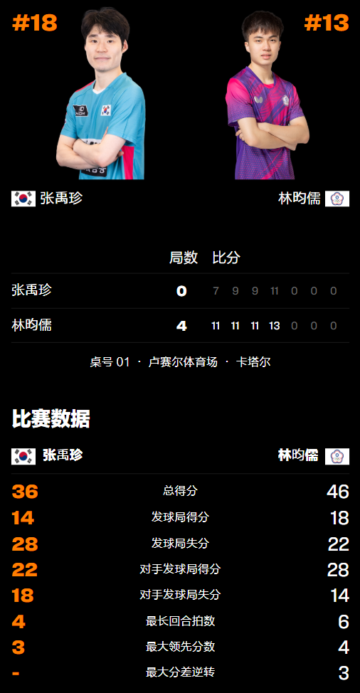 在此之前,两位运动员都曾多次突破中国队主力防线,林昀儒赢过马龙、樊振东、王楚钦、林高远,张禹珍打败过张继科、马龙、许昕、王楚钦、梁靖崑、林高远、林诗栋,本次比赛又击败林诗栋,状态的确非常不错。