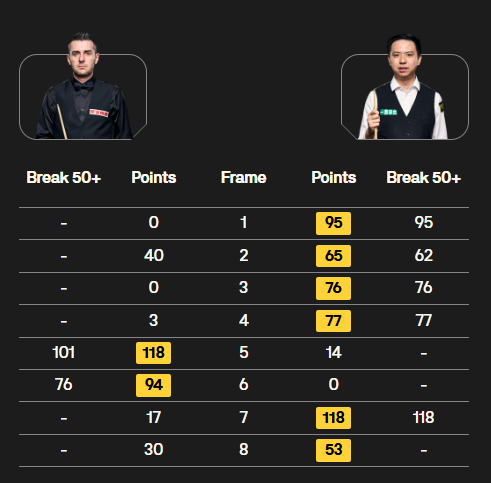 首局,墨菲失误不断,吴宜泽先下一城。第2局,墨菲开杆就漏球,吴宜泽轰出137分破百清台。第3局,乱局,吴宜泽多次上手,3-0领先。第4局,运气球帮忙,墨菲通过斯诺克获机会,扳回一城。