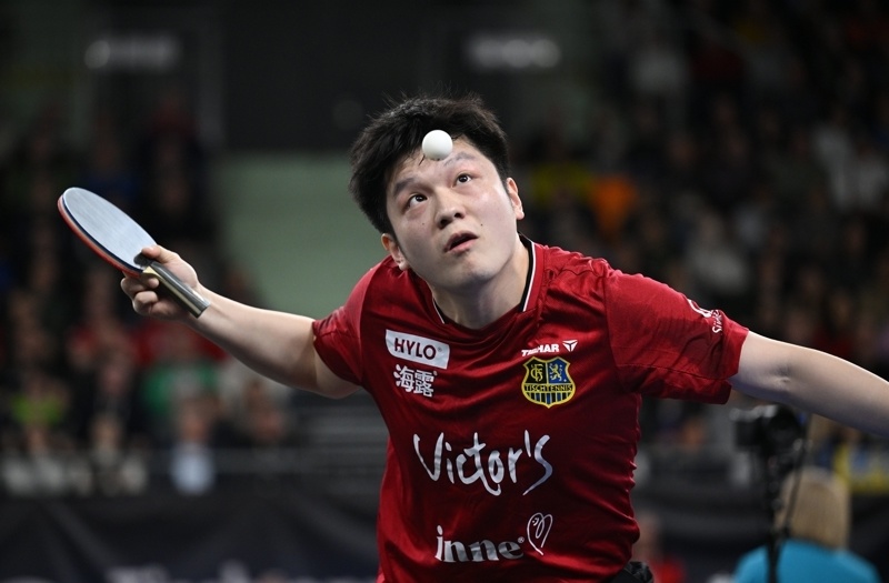 1月4日,萨尔布吕肯队球员樊振东在男子单打比赛中回球。最终他3比0战胜富尔达-马伯策尔队球员奥恰洛夫。