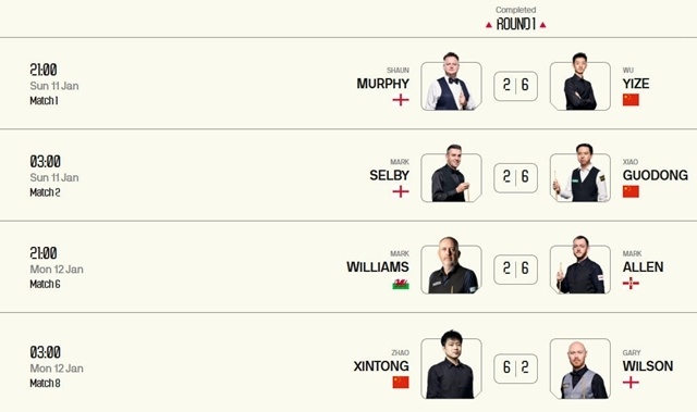 至此,前两个比赛日结束,大师赛8强决出了4席,中国选手独占其三!接下来,还将会有斯佳辉、丁俊晖两位中国选手出战,斯佳辉对阵凯伦威尔逊,丁俊晖大战特鲁姆普,中国选手是否能够全进8强,拭目以待。