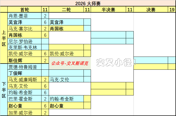 凌晨时段,巫师希金斯对阵霍金斯。这是希金斯连续第32次参加大师赛,大师赛的出勤王。
