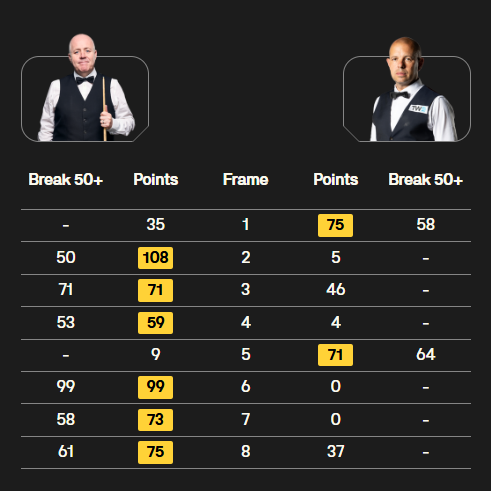 前四局,希金斯先丢一局后,连续打出3杆50+,3-1领先。前四局,希金斯的长台成功率是百分百,进球成功率是97%,状态相当好。