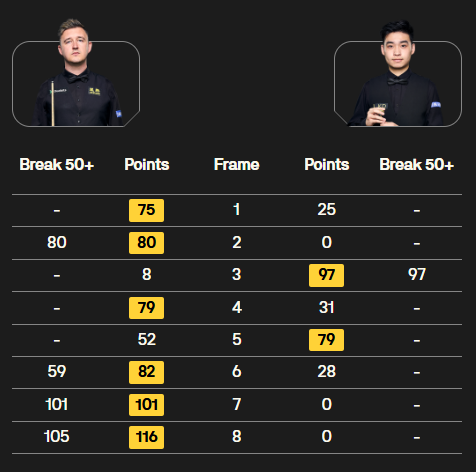 短休后,第5局,双方陷入乱局缠斗,斯佳辉险遭逆转,2-3。此后,囧哥掌控比赛。第6局,囧哥抓住斯佳辉失误,单杆58分制胜,第7局,囧哥抓住斯佳辉安全球失误,一杆破百。第8局,囧哥长台上手,再添一杆破百,6-2终结比赛。