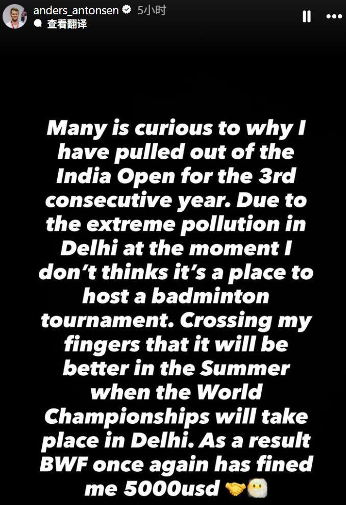 那么,为何还有如此多的球员选择退赛呢?两位丹麦球员的发言可以解释这一切。男单球员安东森在社媒发文,“很多人好奇为什么我连续第三年退出印度公开赛。原因是德里的空气污染非常严重,我认为这里并不适合举办羽毛球比赛。我只能祈祷世界锦标赛举行时情况会好一些。”