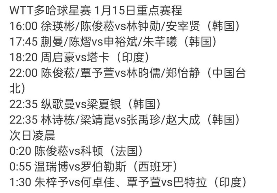 WTT球星赛:1月15日赛程公布!国乒已输4场,林诗栋再碰张禹珍