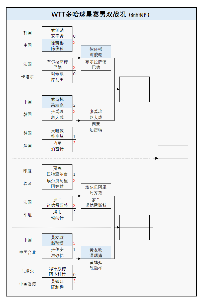 陈垣宇/蒯曼3-0库瓦里/埃尔巴兹(卡塔尔):11-2、11-6、11-6;
