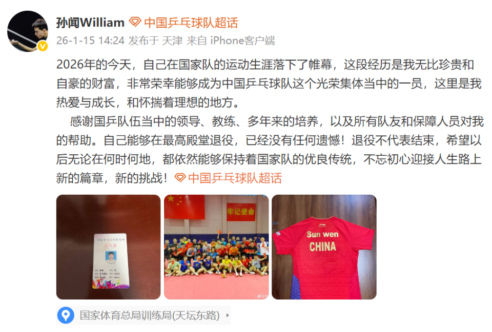 由于成绩不再显眼,孙闻也逐渐淡出了乒坛的焦点,此后六年更是与主力位置渐行渐远,在这期间,他见证了同龄选手樊振东一步步走上职业生涯巅峰,然而自己却在短暂的高光后迅速归于平静,直到2026年1月15日正式宣布离开国家队。