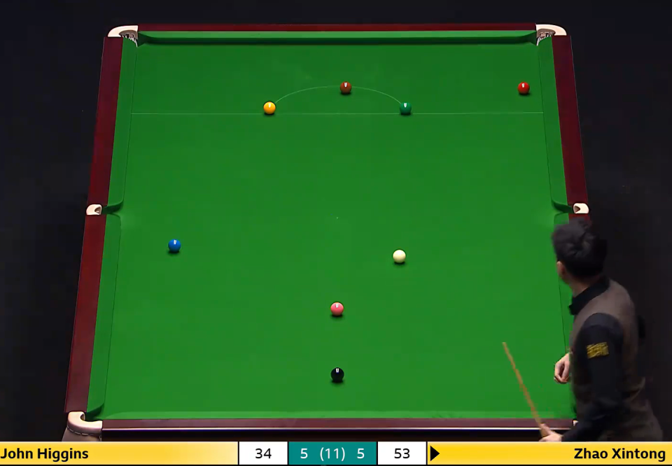 短休后,第5局,赵心童抓住希金斯长台失误,一杆74分获胜。第6局,虽有简单蓝球失误,希金斯通过两个长台,两次上手完成超分,双方战成3平。这也意味着,不会连续出现6-2的魔幻比分了。