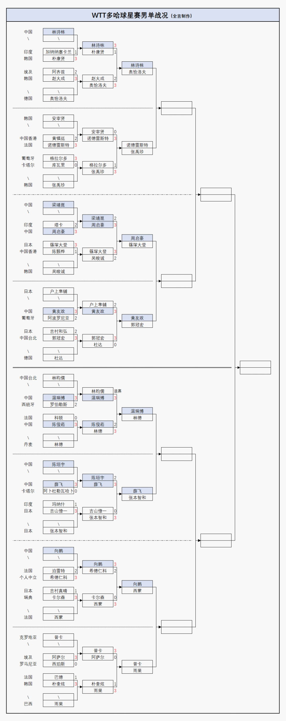 1/8区:林诗栋(中国)3-1朴康贤(韩国),奥恰洛夫(德国)3-2赵大成(韩国);