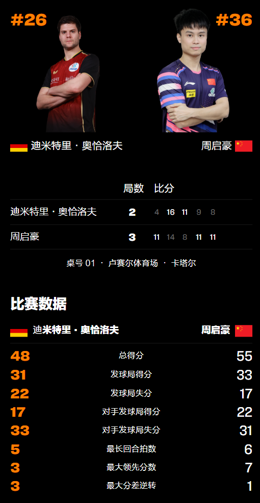 第三局双方依旧打得非常激烈,周启豪开局领先被奥恰洛夫不断发力搏杀破防,纠缠至8-8平后德国选手连得2分拿到局点,关键时刻又以反手弧圈球进攻得分,周启豪最终以8-11再次落败,由此而被对方逆转大比分逼入绝境。