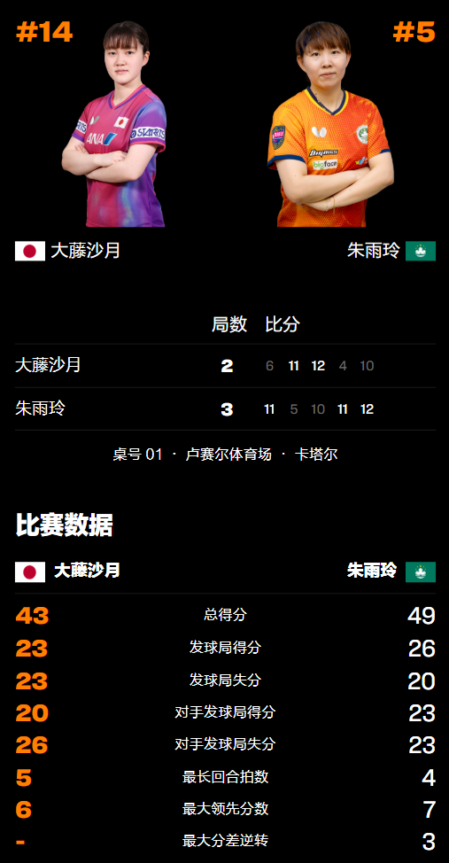 2026年1月18日,乒乓球WTT多哈球星赛第二场女单半决赛,中国澳门世界冠军朱雨玲苦战5局、挽救赛点后3-2击败日本选手大藤沙月,由此而晋级决赛与另一位日本选手、削球打法名将佐藤瞳争夺冠军,至于国乒女单则是无人晋级半决赛——朱雨玲VS大藤沙月战况请看下文。