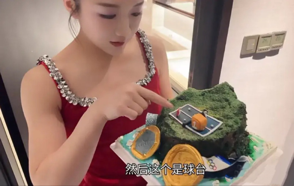 她收到了很多朋友送来的蛋糕、礼物、以及生日祝福。在陈梦手里的是一个海岛形状的蛋糕,上面有乒乓球台、还有金牌。