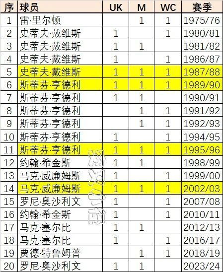 (2)斯蒂芬-亨德利,1989/90赛季和1995/96赛季;