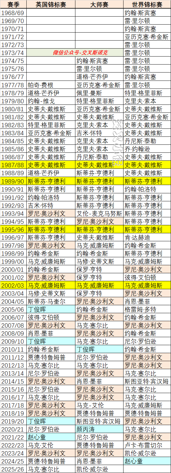 每赛季三大赛,举办顺序和时间相对固定,先英国锦标赛(11-12月),再大师赛(1-2月),最后世界锦标赛(4-5月)。以下图表中,因图表简约需要,英国锦标赛或以英锦赛或UK代称,大师赛或以M代称,世界锦标赛或以世锦赛或WC代称。