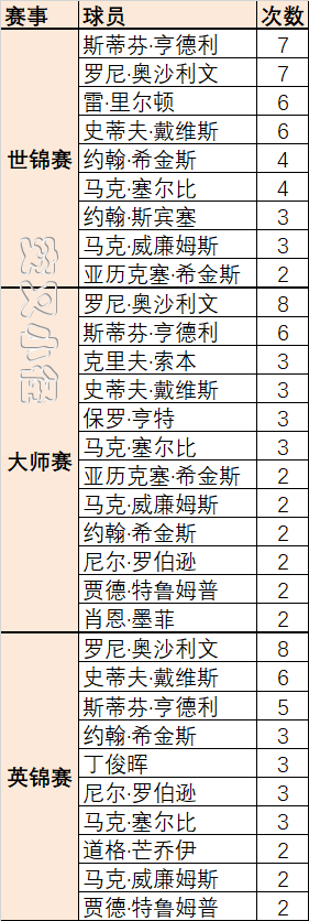 图表5:单项三大赛夺冠两次以上的球员列表。