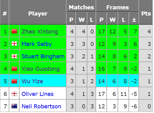 首日的比赛,赵心童4战全胜领跑。赵心童首战吴宜泽,第3局清台、逆转吴宜泽单杆50+,决胜局破百,3-2获胜。次战,赵心童尾局破百,零封尼尔·罗伯逊。第3战,赵心童打出3杆50+,3-1战胜肖国栋。第4战,赵心童打出一杆破百和两杆80+,3-2胜宾汉姆。赵心童目前已经提前锁定小组半决赛的席位。
