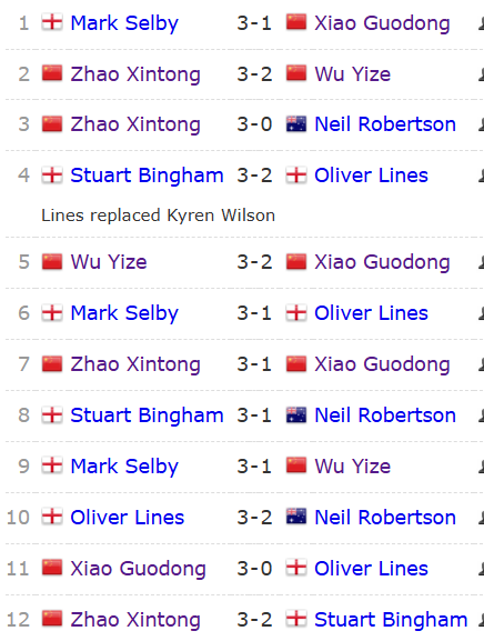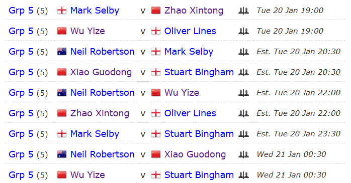 19-20日是第5组比赛,大师赛夺冠的囧哥凯伦·威尔逊,喜提35万英镑美滋滋嗨皮去了,其位置由奥利弗·莱恩斯顶替。囧哥缺席,但第5组的阵容还是蛮强大的,包括参加大师赛的5位TOP16球员,还有前世界冠军老将宾汉姆。