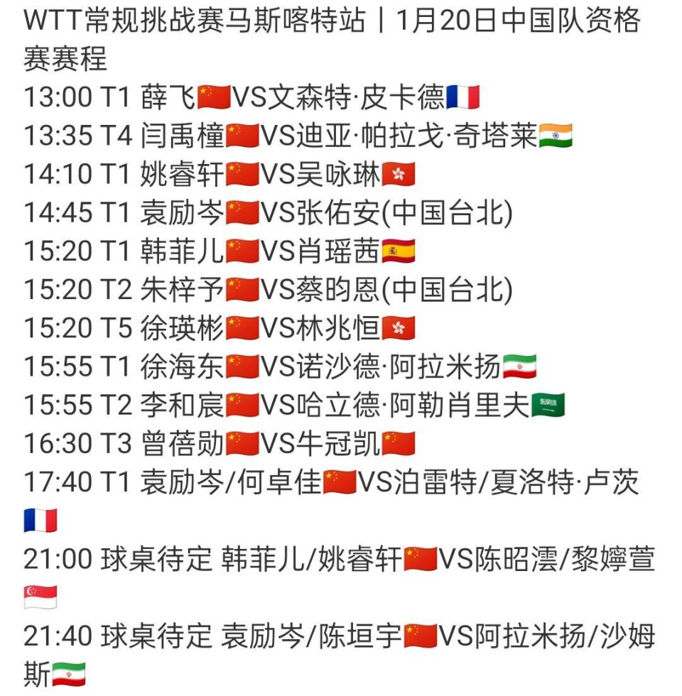 WTT常规赛:1月20日赛程公布!国乒4人输球,16岁小将被淘汰