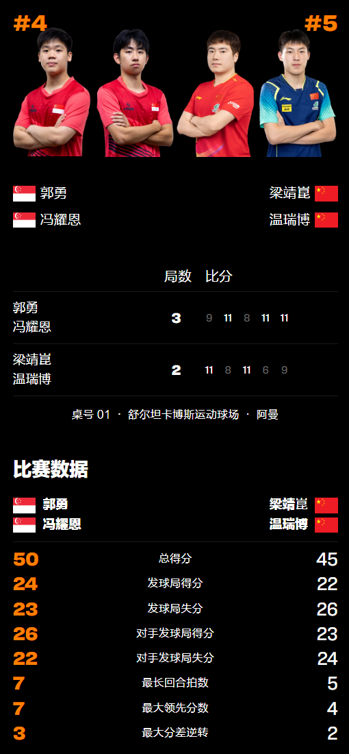 第五局国乒组合上来就领先3分逼对方暂停进行调整,暂停结束后被冯耀恩/郭勇强势追至3-3平,紧接着再丢2分被逆转双方交换场地,随后双方再次你追我赶,最终还是新加坡选手的发挥更加稳定,冯耀恩/郭勇在7-3领先、7-8被逆转的情况下稳住阵脚,最终通过反手拧拉连续得分后以11-9险胜结束战斗,由此而再次击败对面的两位国乒选手晋级8强。
