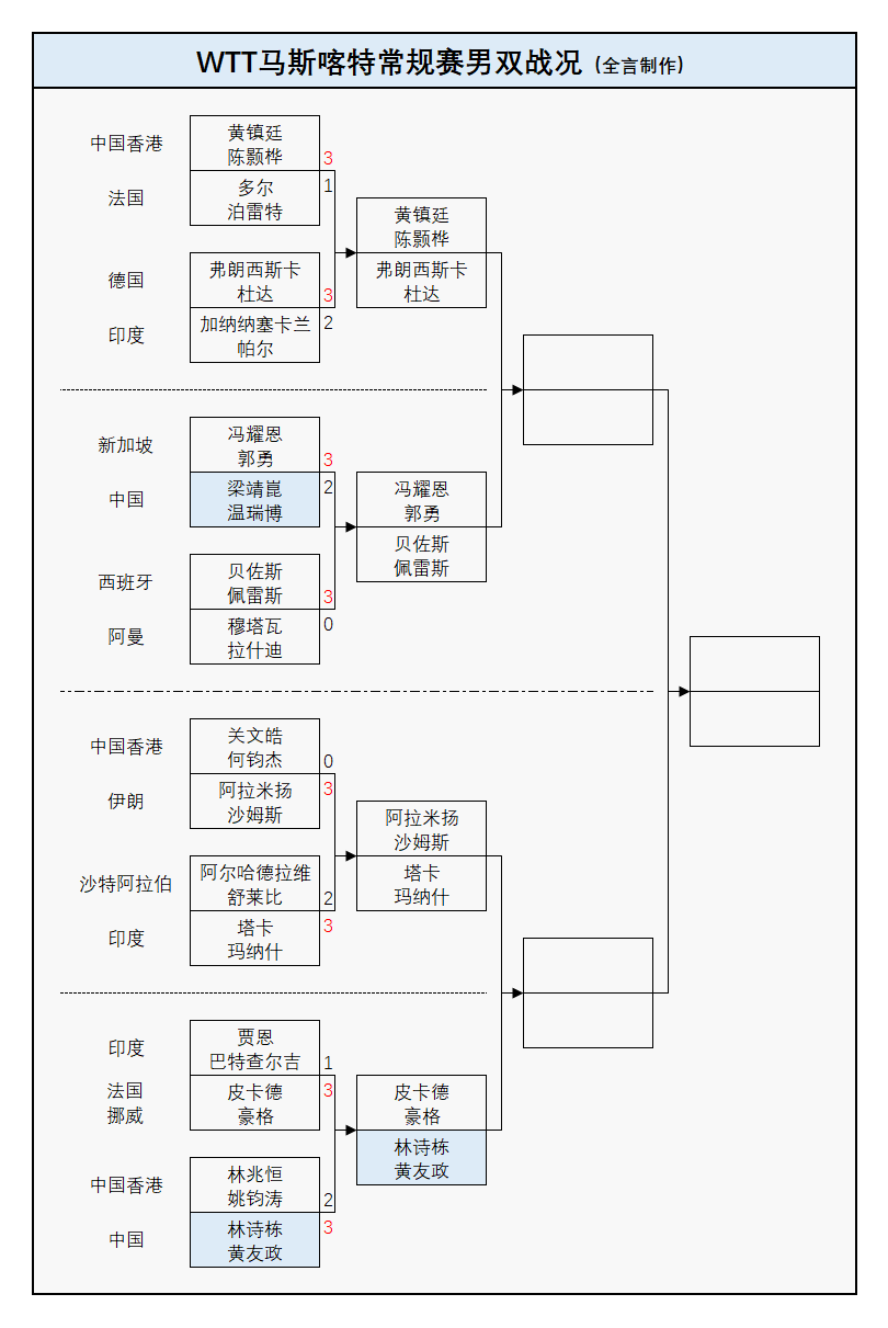 国乒男双目前损失惨重,仅林诗栋/黄友政1对组合惊险过关,梁靖崑/温瑞博正赛一轮游,袁励岑/陈垣宇更是止步资格赛;混双也输掉一半,其中黄友政/石洵瑶、薛飞/王晓彤获得晋级,陈垣宇/韩菲儿止步正赛首轮,袁励岑/何卓佳资格赛没出线。