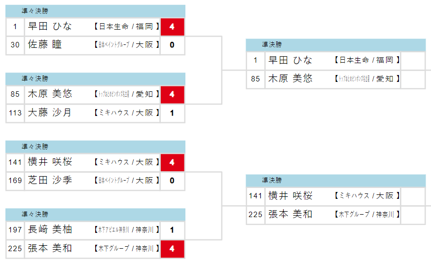 下半区:横井咲樱4-0芝田沙季、张本美和4-1长崎美柚。