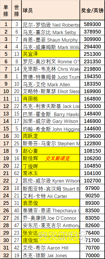其次关注下球员锦标赛门票的争夺(单赛季前16)。距离球员锦标赛,仅剩两站排名赛,德国大师赛和世界大奖赛。球员锦标赛门票的争夺,主要是目前已经拿到世界大奖赛门票的球员,其中包括10位中国球员。