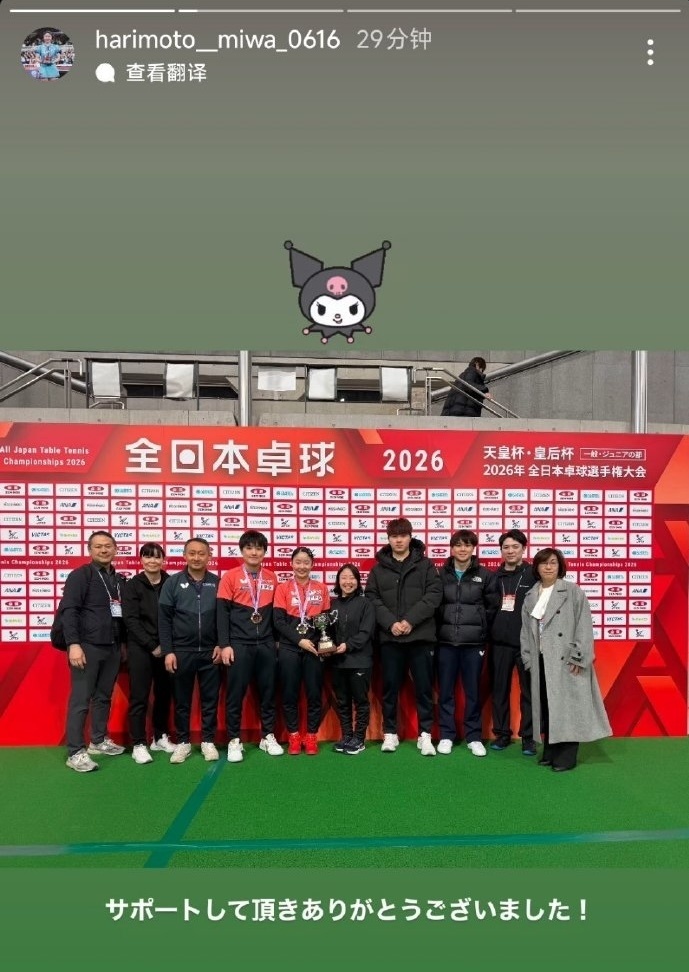 虎扑01月26日讯 2026全日本乒乓球锦标赛女单决赛,张本美和4-3早田希娜,获得冠军。张本美和更新社媒发文,内容如下: