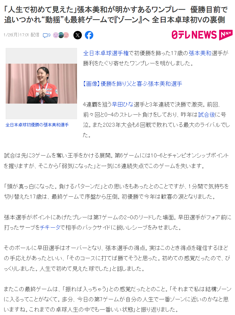 日媒盛赞了张本美和目前的状态,17岁的张本首次获得冠军,她在上次、上上次决赛都是0-4惨败,去年的决赛后嚎啕大哭,2023年的决赛是鏖战6局败北,从2023年后张本美和似乎开始变得软弱,但随着比赛经验的丰富2026年的张本美和迎来截然不同的状态,似乎属于她的时代到来了,在第六局被逆转后,决胜局的她就进入Zone的状态,她没有了 软弱全是坚韧、求胜,这或许是17岁的张本美和乒乓球人生的最好状态。