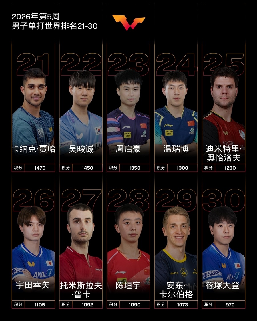 2026赛季开启至今,温瑞博表现亮眼。多哈球星赛从资格赛突围,爆冷击败世界第三雨果‧卡尔德拉诺后获亚军;马斯喀特站再进一步,夺得职业生涯首个成人国际赛事冠军。其世界排名从月初的第53位跃升至第24位,成为国际乒坛上升势头最猛的新星。