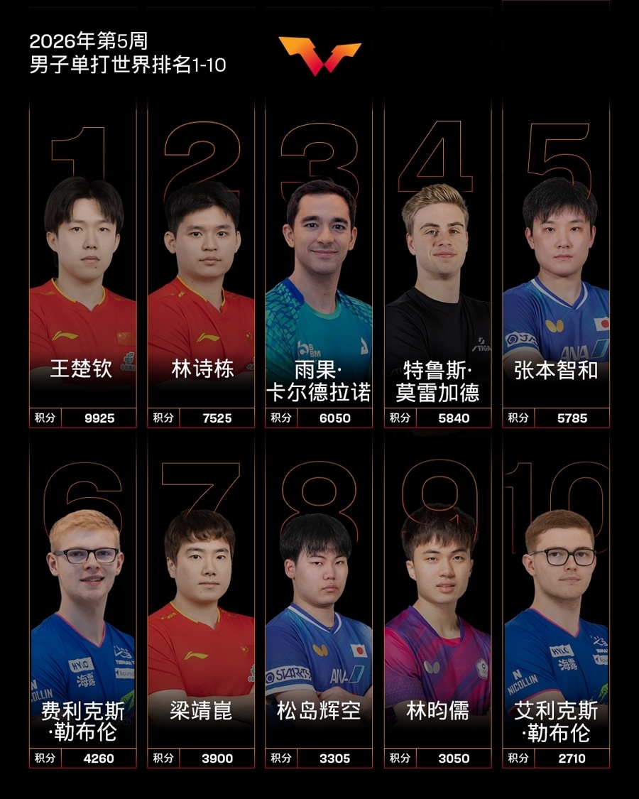 男单方面,国乒虽保住前二席位,但优势已现松动。王楚钦以较大积分优势继续领跑,林诗栋紧随其后占据次席,两人组成的“双保险”暂将前二锁定中国队,梁靖崑位列第七,但前十中仅3名中国选手的配置,与女乒形成鲜明对比。更严峻的是积分竞争已进入“贴身肉搏”阶段:排名第三的巴西选手雨果‧卡尔德拉诺仅落后林诗栋不到1500分,而林诗栋积分中包含2025年新加坡大满贯的2000分,这部分积分将在2026年2月正式到期。若其后续赛事无法填补积分缺口,世界第二的位置极可能被雨果取代。