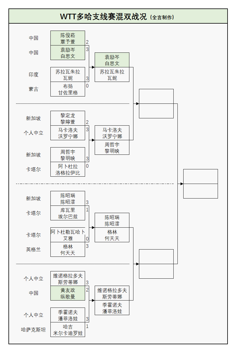混双:袁励岑/白思文3-2陈俊菘/覃予萱,黄友政/纵歌曼2-3维诺格拉多夫/斯劳蒂娜(个人中立)。