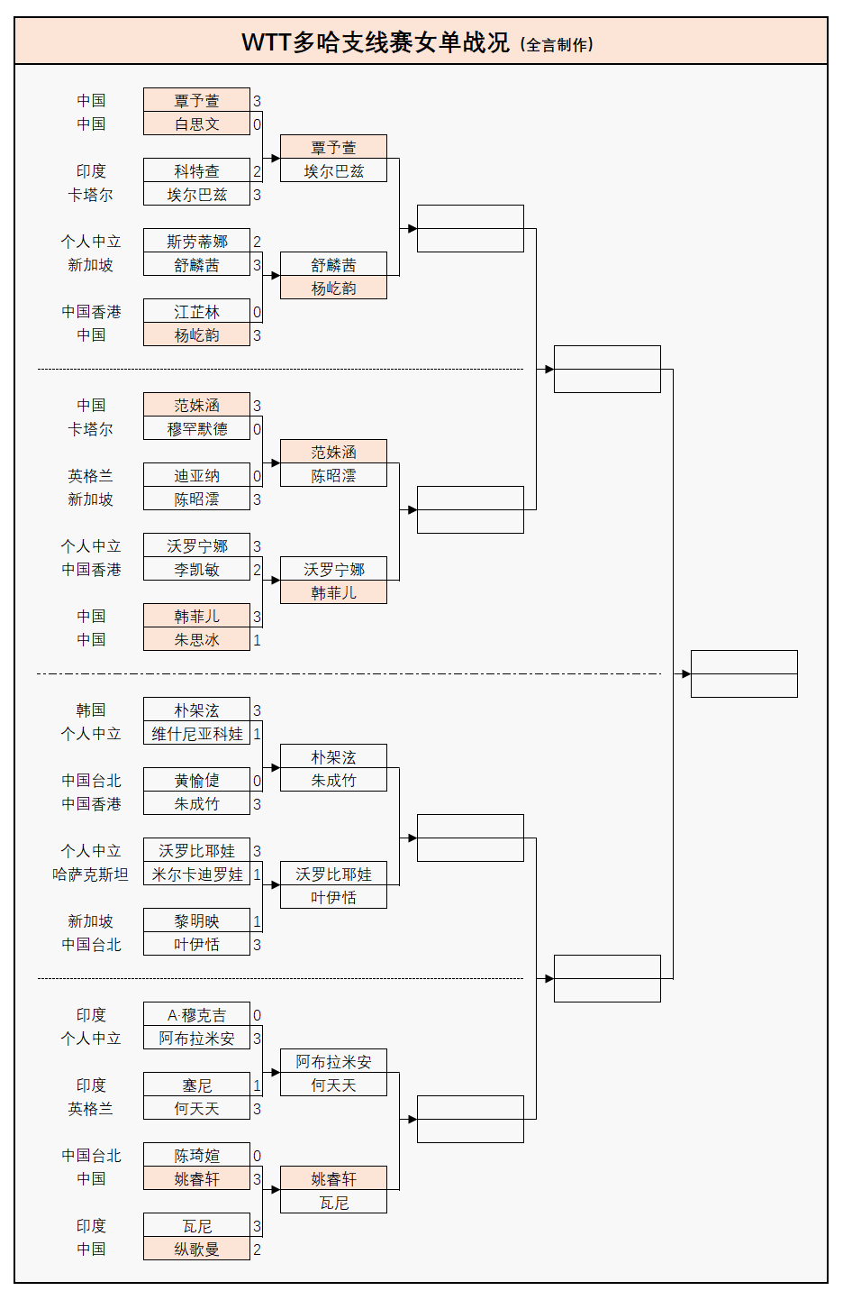 女单:覃予萱3-0白思文、韩菲儿3-1朱思冰,姚睿轩3-0陈琦媗(中国台北)、杨屹韵3-0江芷林(中国香港)、范姝涵3-0穆罕默德(卡塔尔),纵歌曼2-3瓦尼(印度);