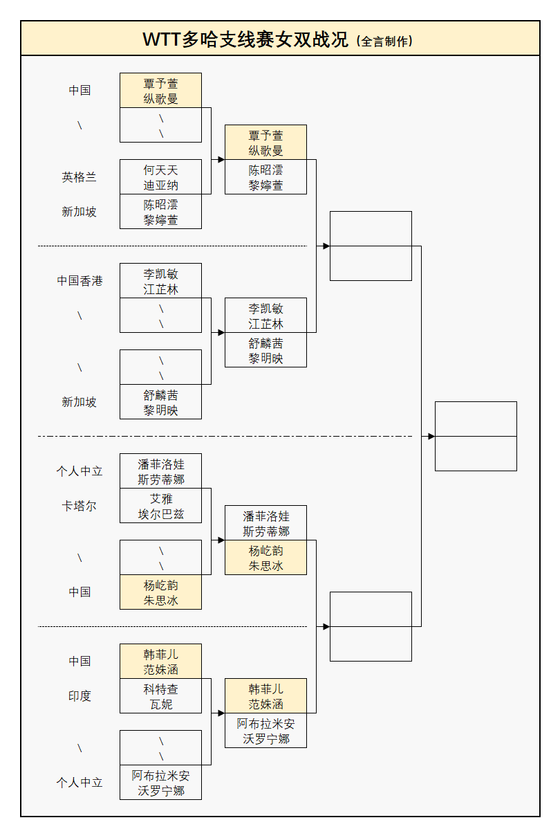 16:00,杨屹韵/朱思冰VS潘菲洛娃/斯劳蒂娜(个人中立)、韩菲儿/范姝涵VS阿布拉米安/沃罗宁娜(个人中立)、覃予萱/纵歌曼VS陈昭澐/黎嬋萱(新加坡);