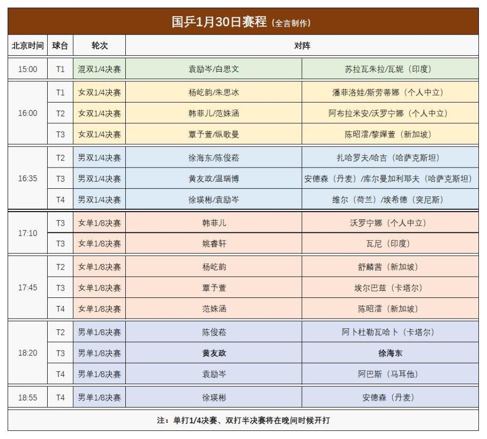 目前除女双覃予萱/纵歌曼、杨屹韵/朱思冰首轮轮空以外,其余国乒单打选手与双打组合均已结束首秀,接下来大家马上将参加新的战斗——1月30日上半场的中国队比赛安排如下: