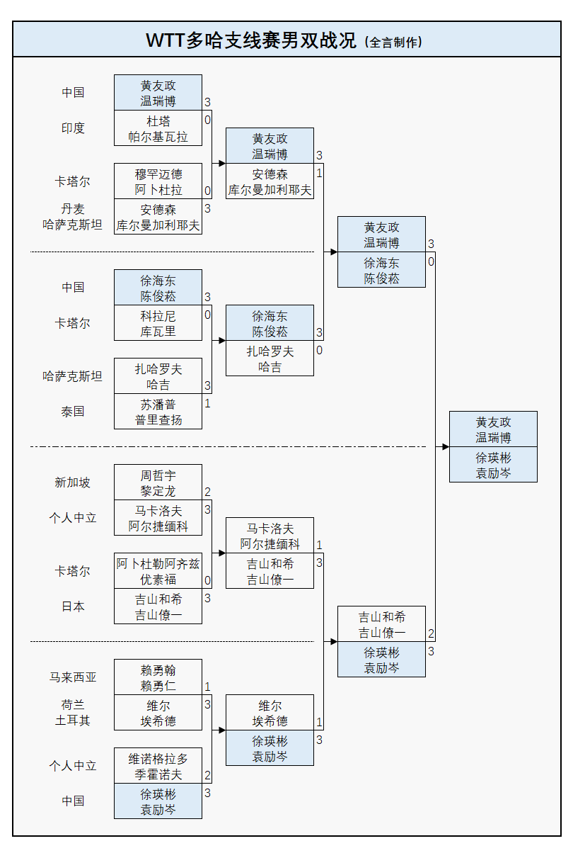 男双:徐海东/陈俊菘3-0扎哈罗夫/哈吉(哈萨克斯坦)、黄友政/温瑞博3-1安德森(丹麦)/库尔曼加利耶夫(哈萨克斯坦)、徐瑛彬/袁励岑3-1维尔(荷兰)/埃希德(突尼斯);