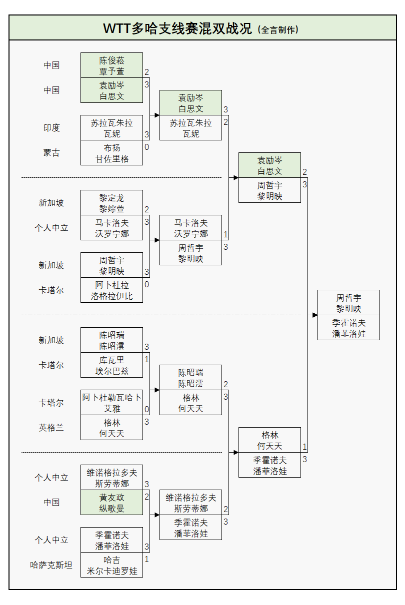 17:20混双决赛,周哲宇/黎明映(新加坡)VS季霍诺夫/潘菲洛娃(个人中立);